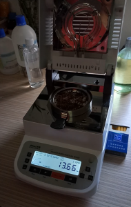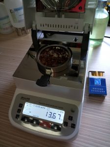 - 測試煙絲細(xì)條:取6克煙絲細(xì)條置于不銹鋼托盤中,為了使測試過程中煙絲水分儀將煙絲烘干烘透,我們將煙絲攤成分散狀,以便溫度能滲透進(jìn)煙絲內(nèi)部。用鑷子將煙絲細(xì)條平鋪均勻,為避免煙絲烘烤后變焦,我們將溫度設(shè)置在135℃,按“START”鍵開始測試,2分08秒后檢測結(jié)束,檢測數(shù)據(jù)顯示13.67%;